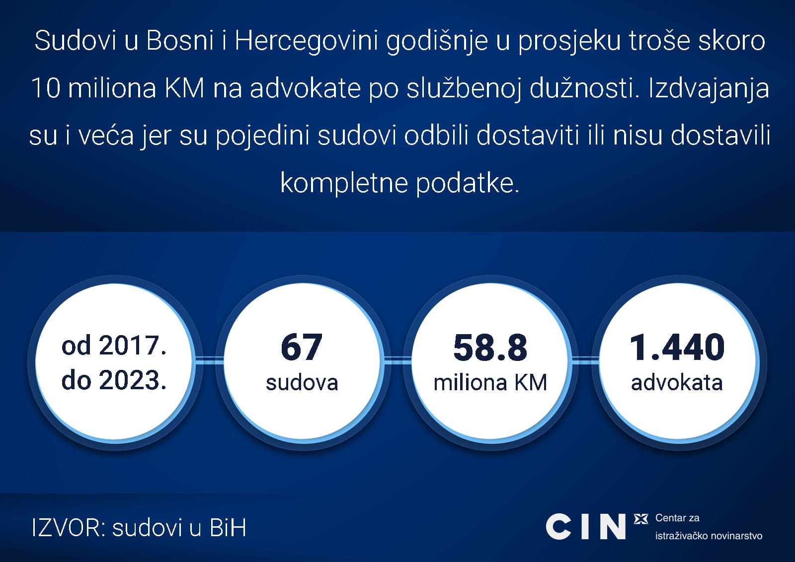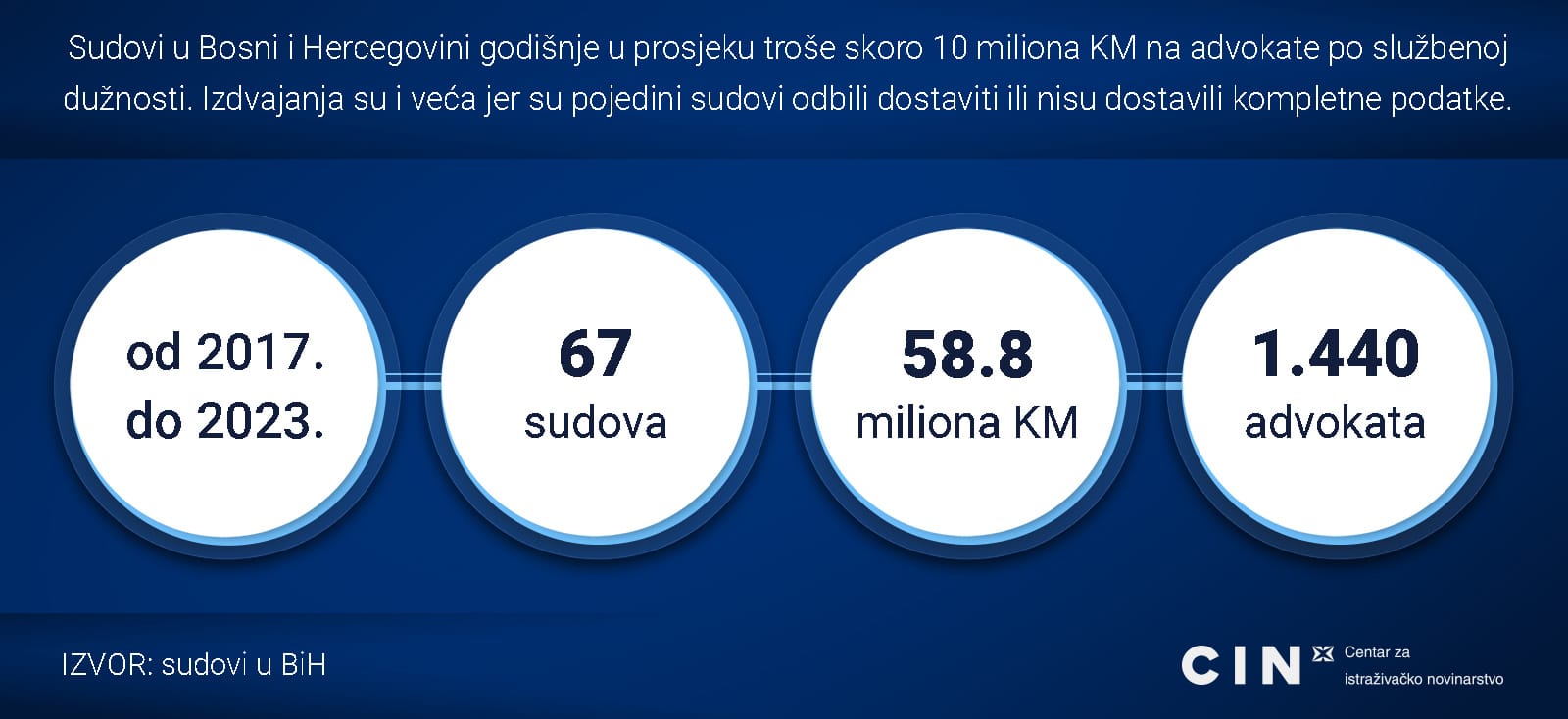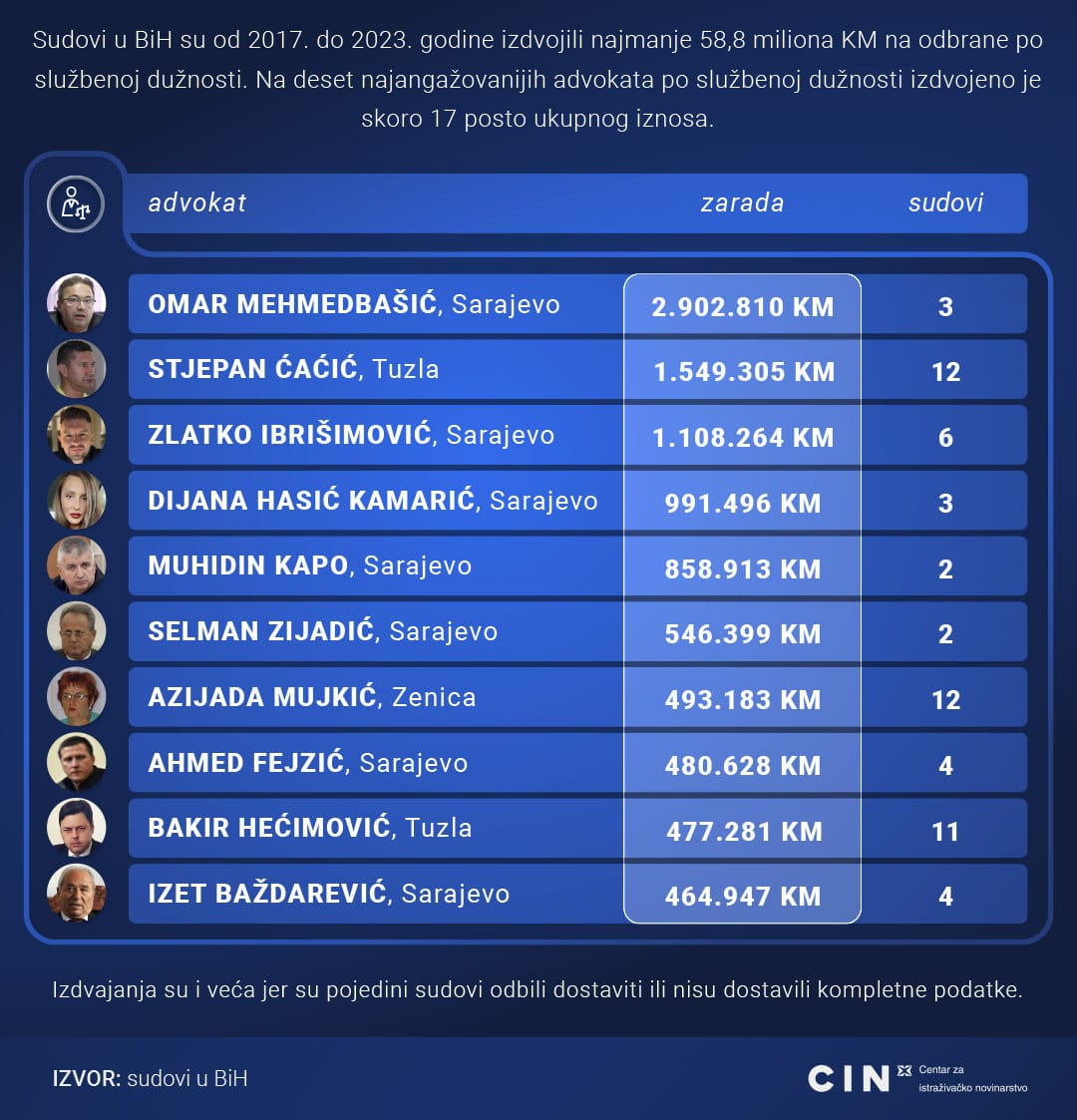 Na odbrane po službenoj dužnosti je od 2017. do kraja 2022. godine izdvojeno najmanje 58,8 miliona KM. Iako je više od 1.440 branilaca bilo angažovano u službenim odbranama, za njih deset isplaćena je šestina ovog iznosa. Iznosi koje su advokati zaradili su i veći, međutim pojedini sudovi nisu Centru za istraživačko novinarstvo (CIN) dostavili podatke.