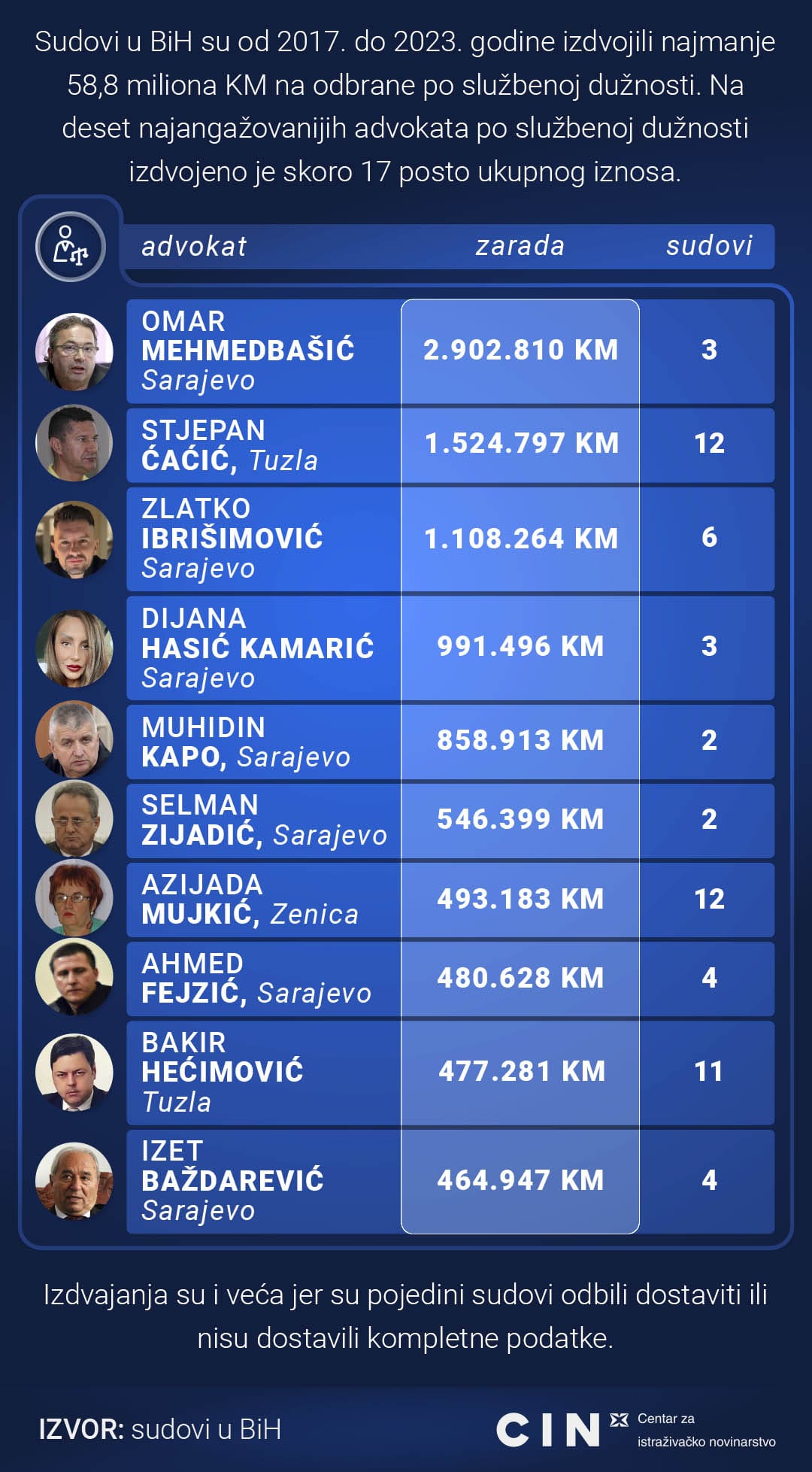 CIN više od decenije prikuplja podatke o isplatama advokata po službenoj dužnosti koje plaćaju građani BiH. Prema prikupljenim podacima, od 2005. godine, uz Mehmedbašića, među deset najplaćenijih su njegove kolege iz Sarajeva: Muhidin Kapo, Selman Zijadić i Izet Baždarević.