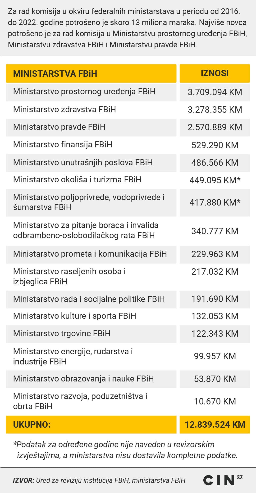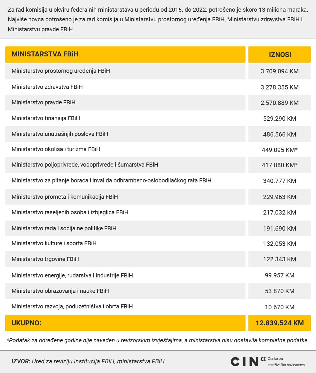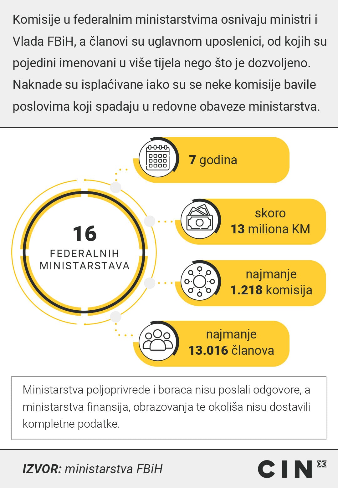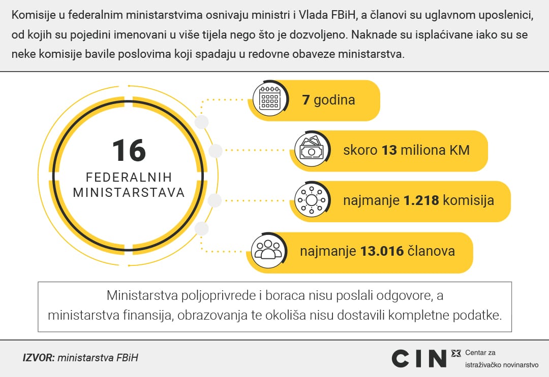 Šesnaest ministarstava Federacije Bosne i Hercegovine potrošilo je 12,8 miliona KM kako bi platilo članove komisija i radnih tijela od 2016. do 2022. godine. Novac je dobilo 2.026 osoba. Njihove zarade kretale su se od nekoliko stotina do više od sto hiljada maraka.
