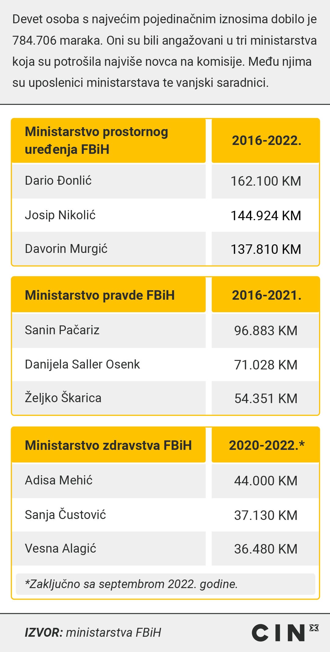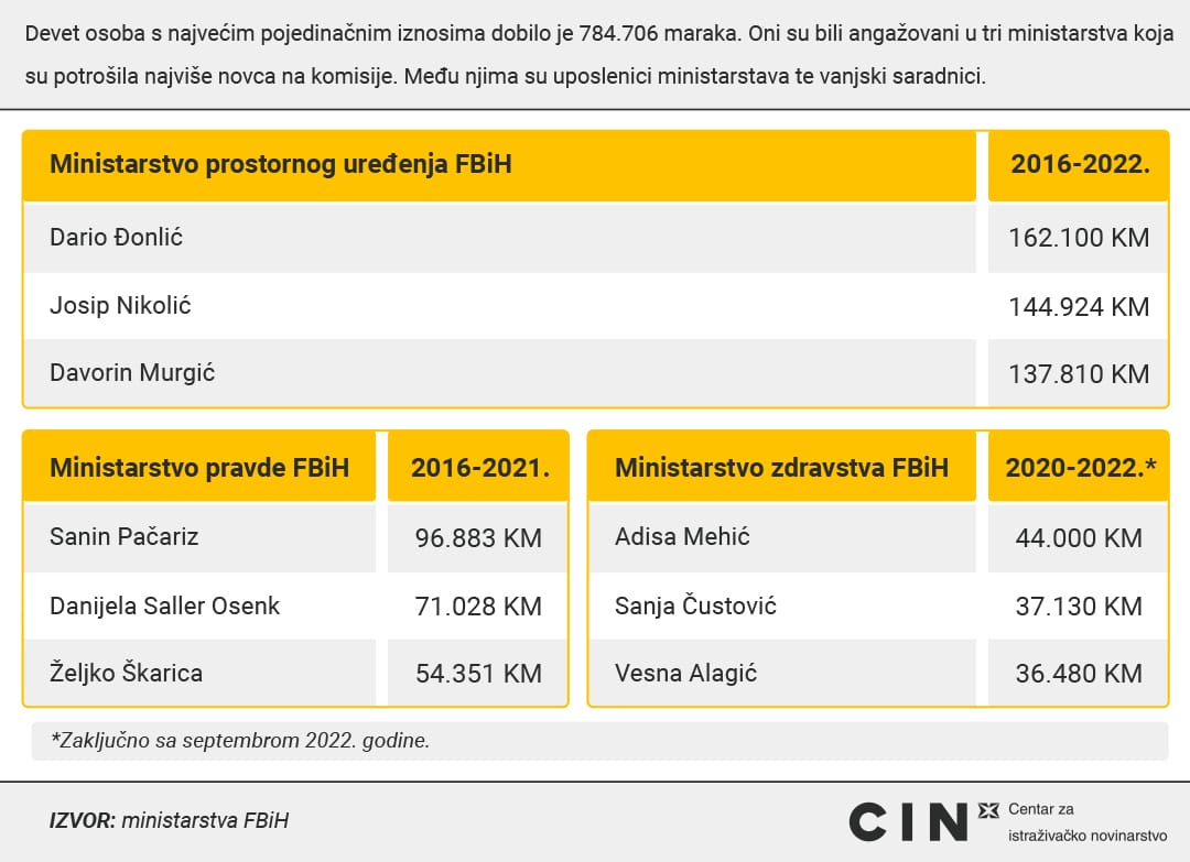 Najviše novca potrošili su Ministarstvo prostornog uređenja, Ministarstvo zdravstva i Ministarstvo pravde, čak 9,5 miliona maraka, tri puta više od preostalih ministarstava zajedno. Pojedinci su mjesečno u komisijama zarađivali više nego radnik s prosječnom platom u Federaciji Bosne i Hercegovine za cijelu godinu.