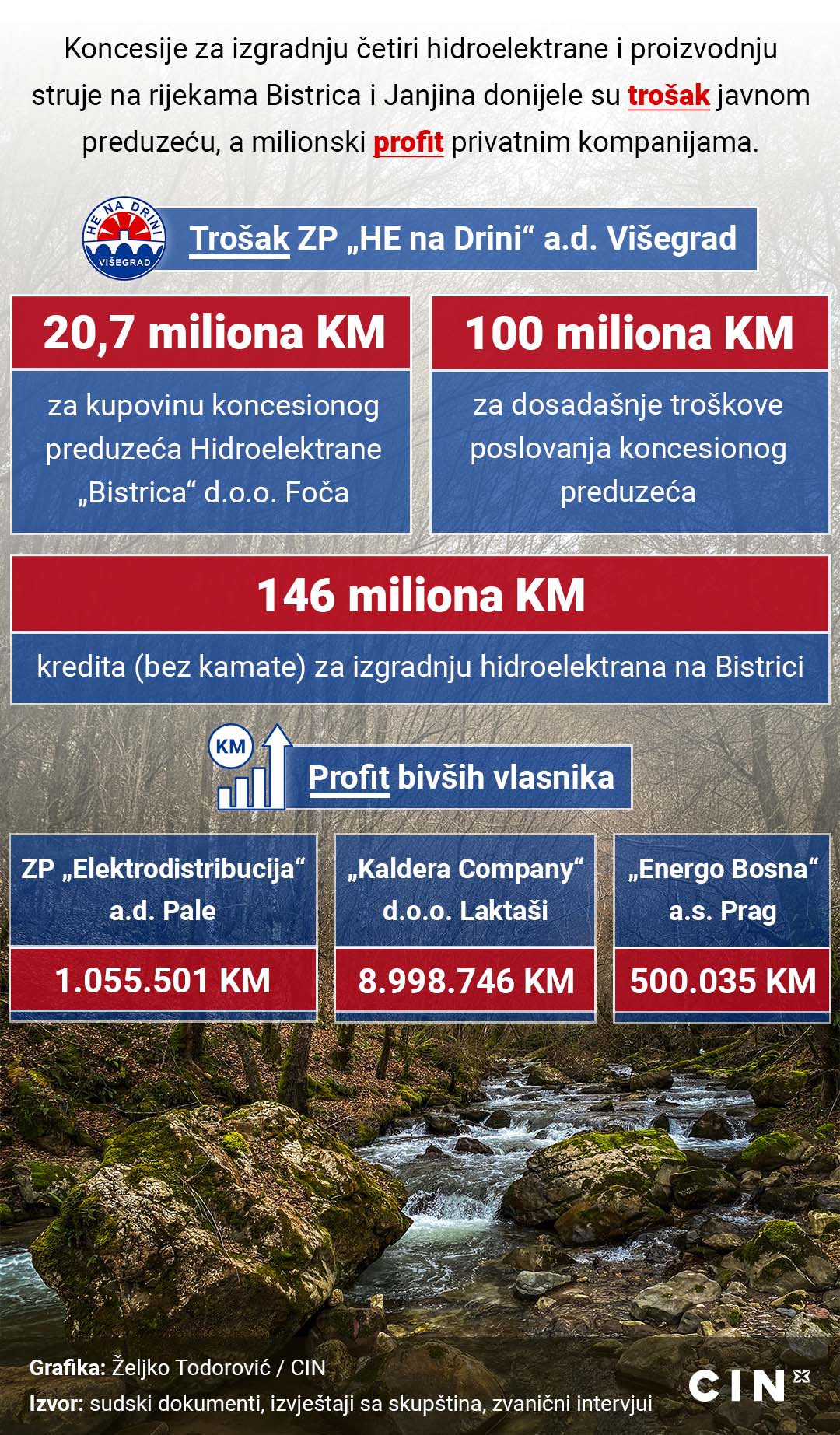 Koncesije za izgradnju četiri hidroelektrane i proizvodnju struje na rijekama Bistrica i Janjina u istočnoj Bosni i Hercegovini (BiH) donijele su trošak javnom preduzeću, a milionski profit privatnim kompanijama.