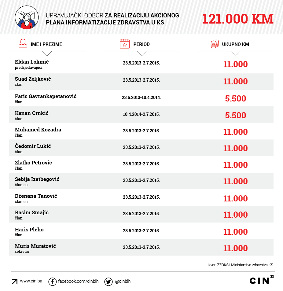 Kantonalna vlada je od 2012. godine formirala četiri komisije koje su trebale unaprijediti zdravstveni sistem. Premijer i ministri su ovjeravali i donosili odluke o imenovanju članova komisija u koje su birali i sami sebe. Za nešto više od tri godine 48 članova ovih komisija naplatilo je više od 250.000 maraka iz budžeta Zavoda.