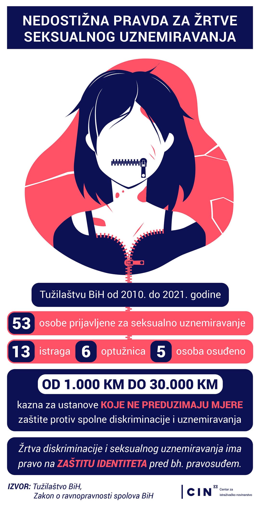 Novinari Centra za istraživačko novinarstvo (CIN) otkrivaju da javni fakulteti i akademije u BiH izbjegavaju pokretanje disciplinskih postupaka za seksualno uznemiravanje koje je kažnjivo otkazom. Svjedočenja o nemoralu profesora prepuštaju pravosuđu koje nije naklonjeno žrtvama – od 53 osobe prijavljene Tužilaštvu BiH za seksualno uznemiravanje u protekloj deceniji, osuđeno je tek pet. Stoga je podrška žrtvama koje se osnaže progovoriti nedovoljna, a pravda teško dostižna.
