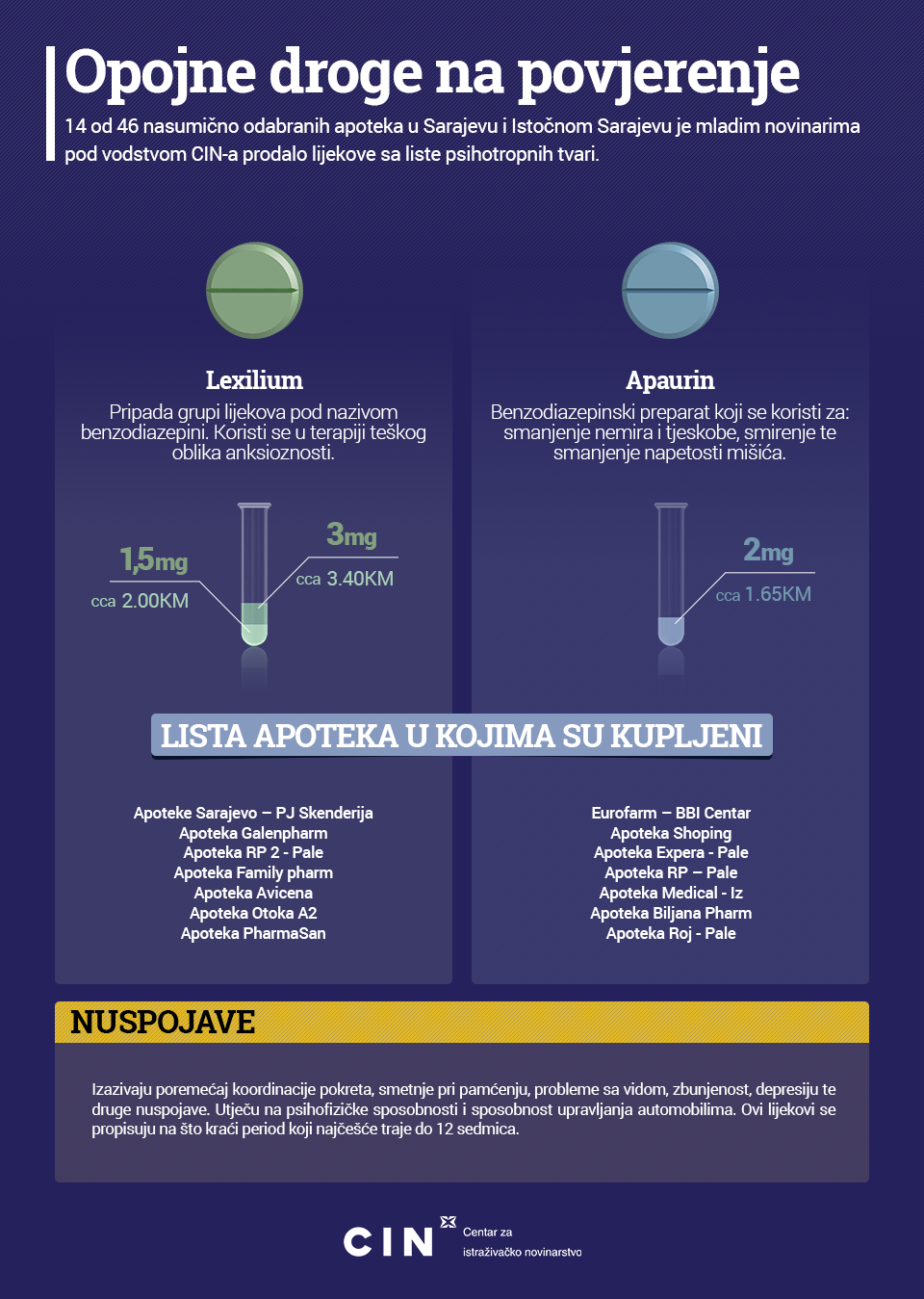 Novinari su u 14 apoteka na području Sarajeva i Istočnog Sarajeva bez recepta kupili lijekove koji se mogu koristiti kao opojne droge. Izdavši ih bez recepta, apotekari su prekršili zakon o sprečavanju zloupotrebe droga, rezultat je istraživanja mladih novinara, provedenog pod okriljem Centra za istraživačko novinarstvo (CIN) iz Sarajeva.