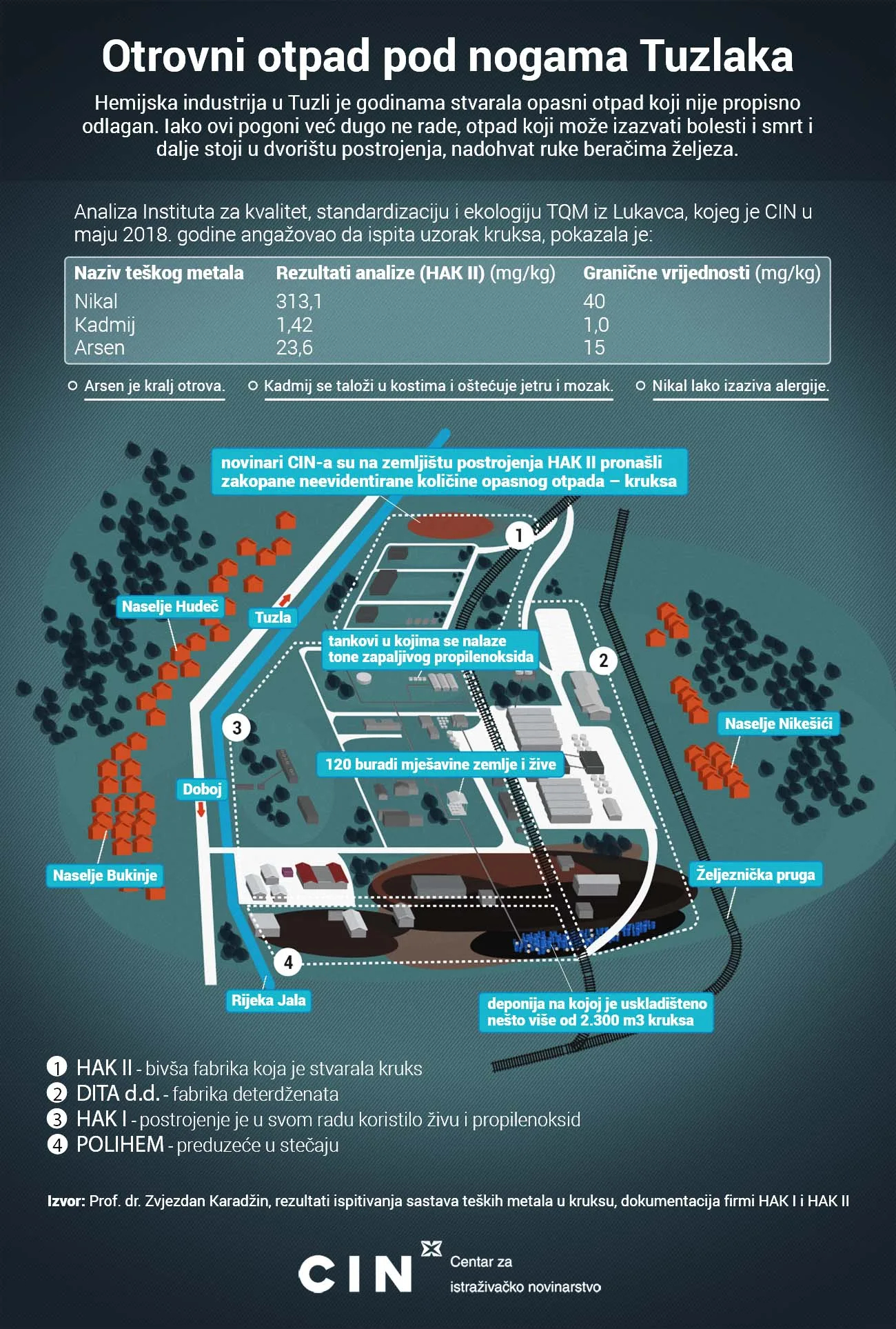 Porodica Bejhanović je kopala na zemljištu postrojenja HAK II u kojem je nivo tri teška metala visoko iznad zakonom dozvoljene granice. To je dokazala analiza Instituta za kvalitet, standardizaciju i ekologiju TQM iz Lukavca kojeg je CIN u maju ove godine angažovao da ispita uzorak uzet na ovom tlu.