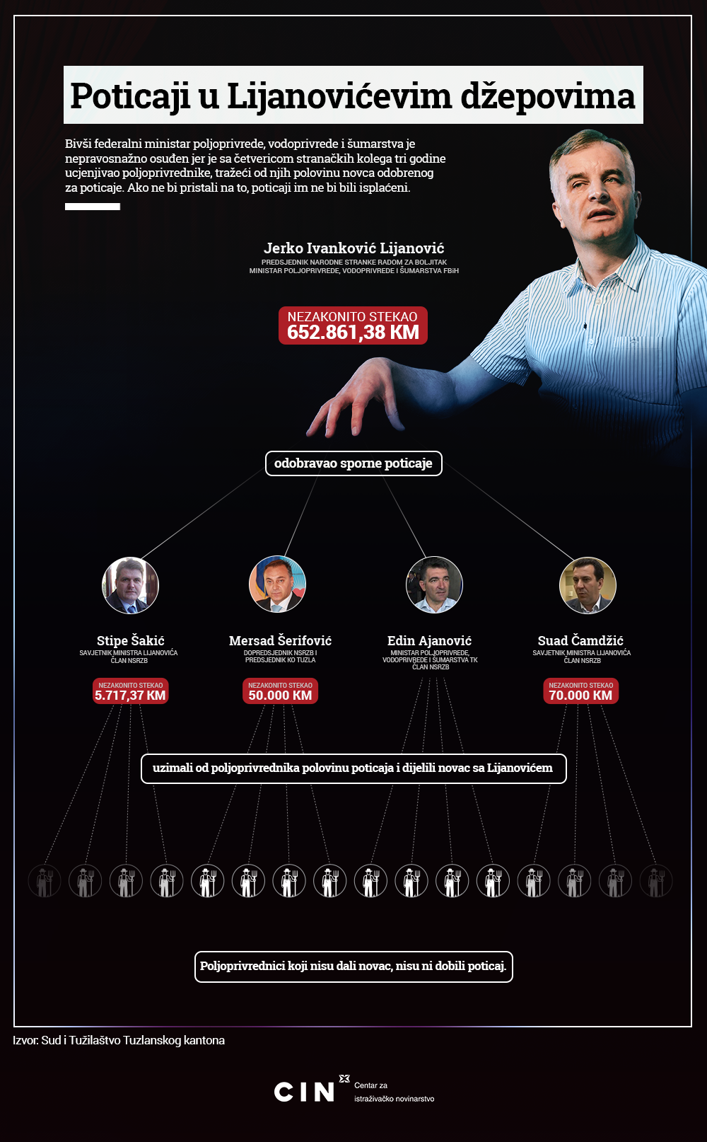 Kantonalni sud u Tuzli nepravosnažno je osudio bivšeg federalnog ministra poljoprivrede Jerka Ivankovića Lijanovića na devet godina zatvora, uz obavezu da vrati nezakonito stečenih oko 650.000 maraka. Prema presudi, on je organizovao kriminalnu grupu koja je od poljoprivrednika tražila pola novca od svakog isplaćenog poticaja. Uz Lijanovića, osuđen je i njegov stranački kolega iz Narodne stranke Radom za boljitak (NSRZB) i bivši savjetnik Stipe Šakić na godinu dana zatvora i novčanu kaznu od 18.000 KM.