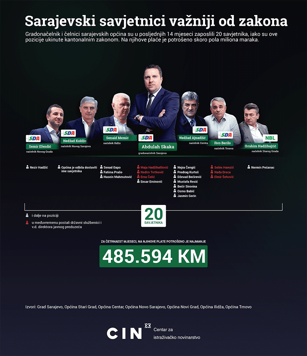 Novinari Centra za istraživačko novinarstvo (CIN) otkrivaju da je nakon ukidanja savjetničke funkcije gradonačelnika i općinske čelnike savjetovalo 20 ljudi. Na njihove plaće je od tada potrošeno najmanje pola miliona maraka.