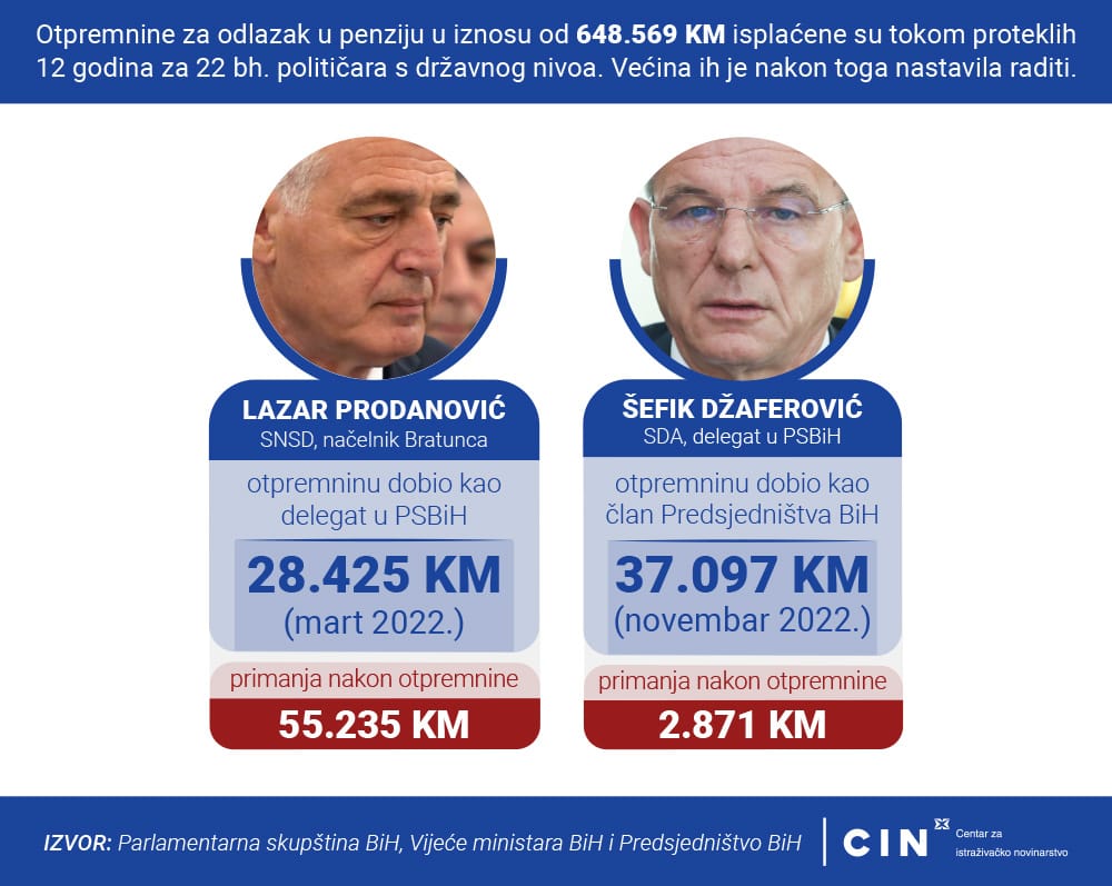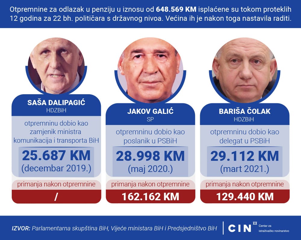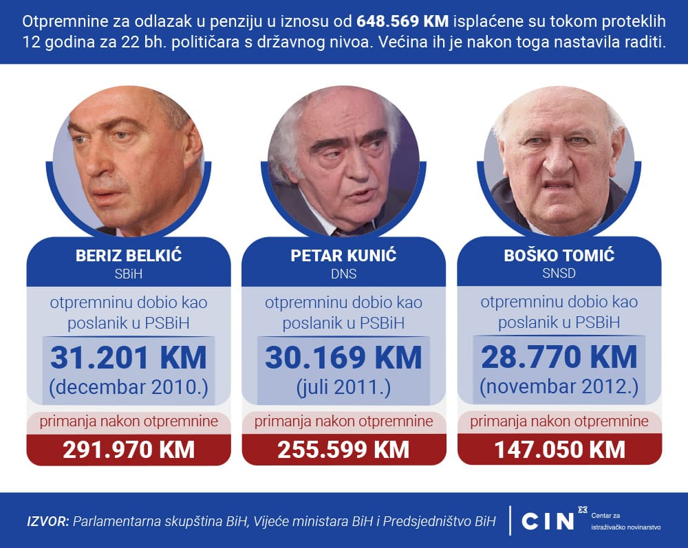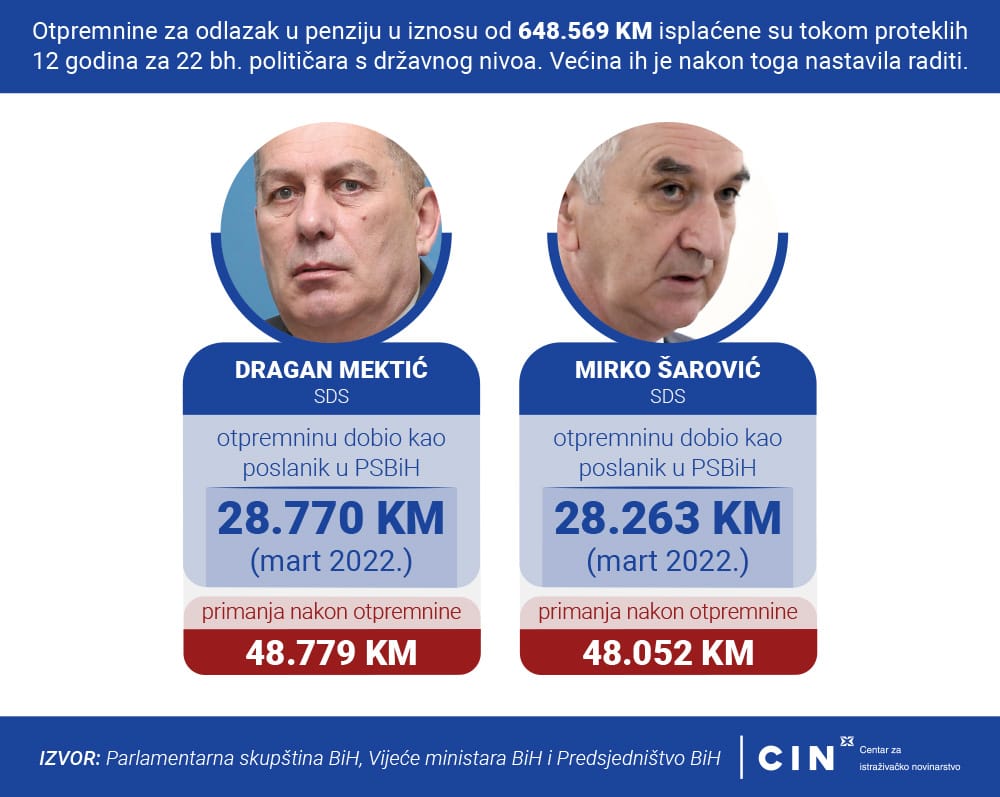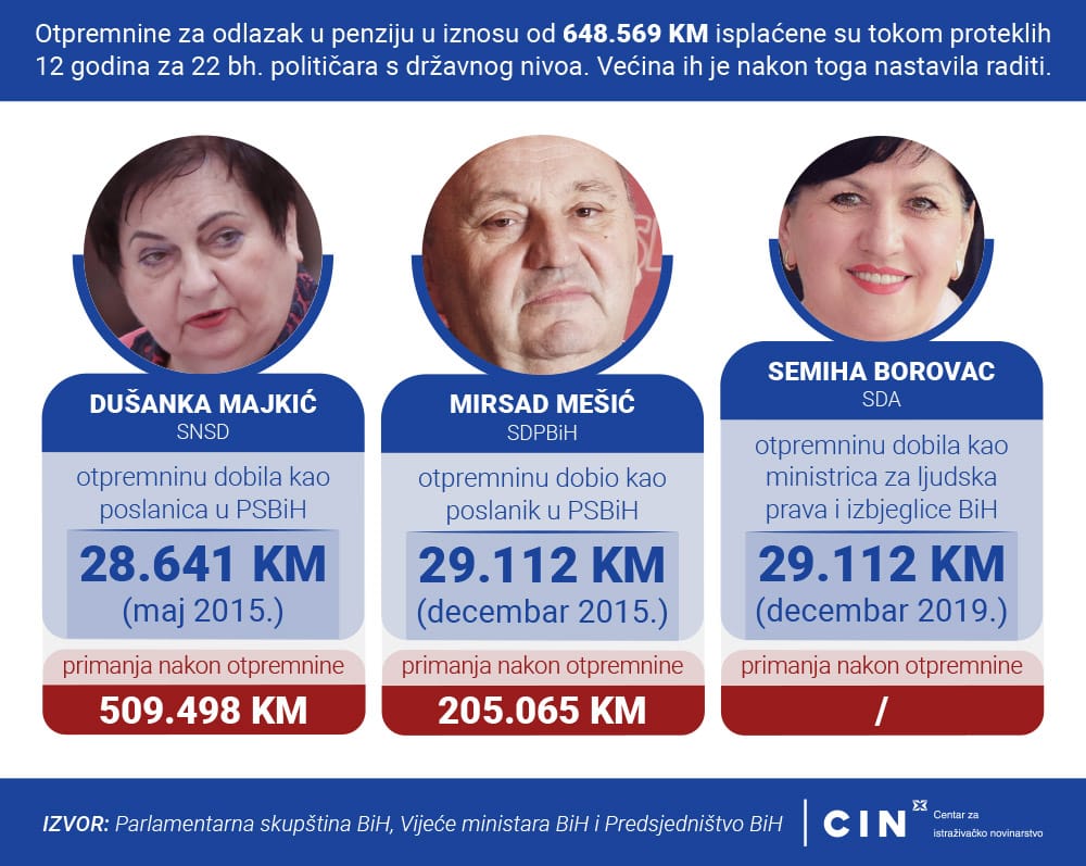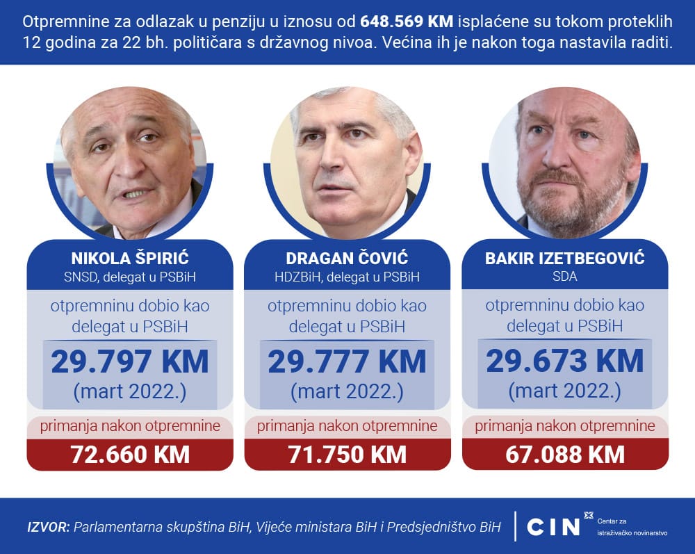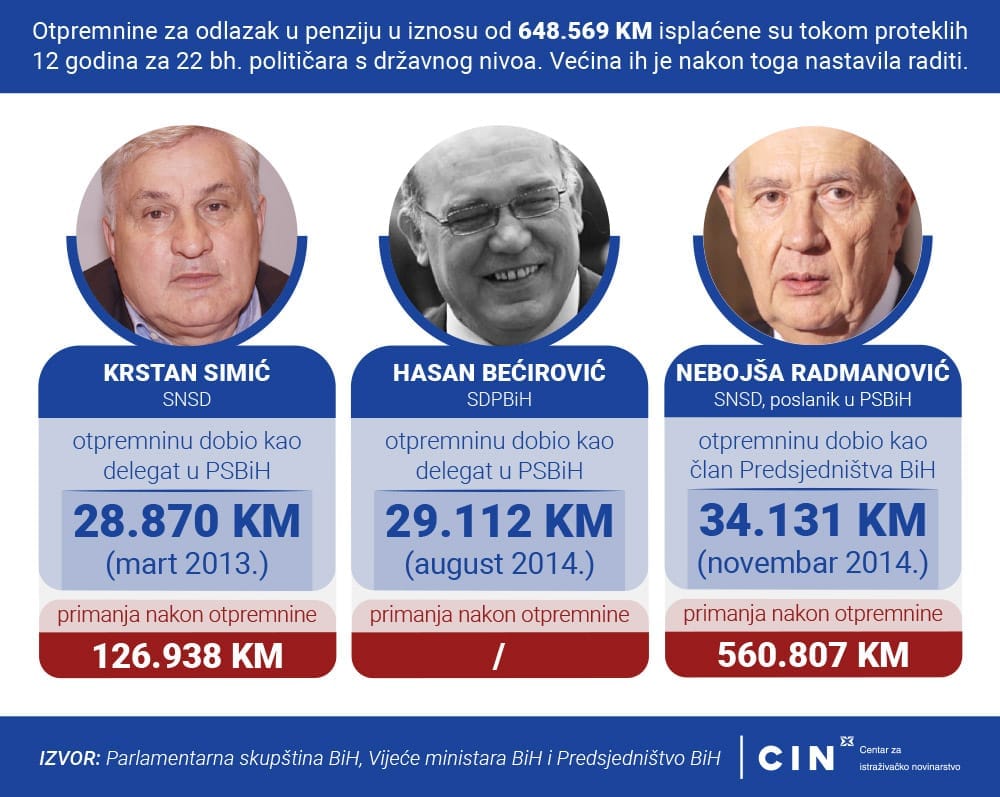 CIN je ranije objavio da je u državnim institucijama od početka 2010. do marta 2021. godine isplaćeno 17,5 miliona KM za odlazak u penziju 1.973 uposlenika.