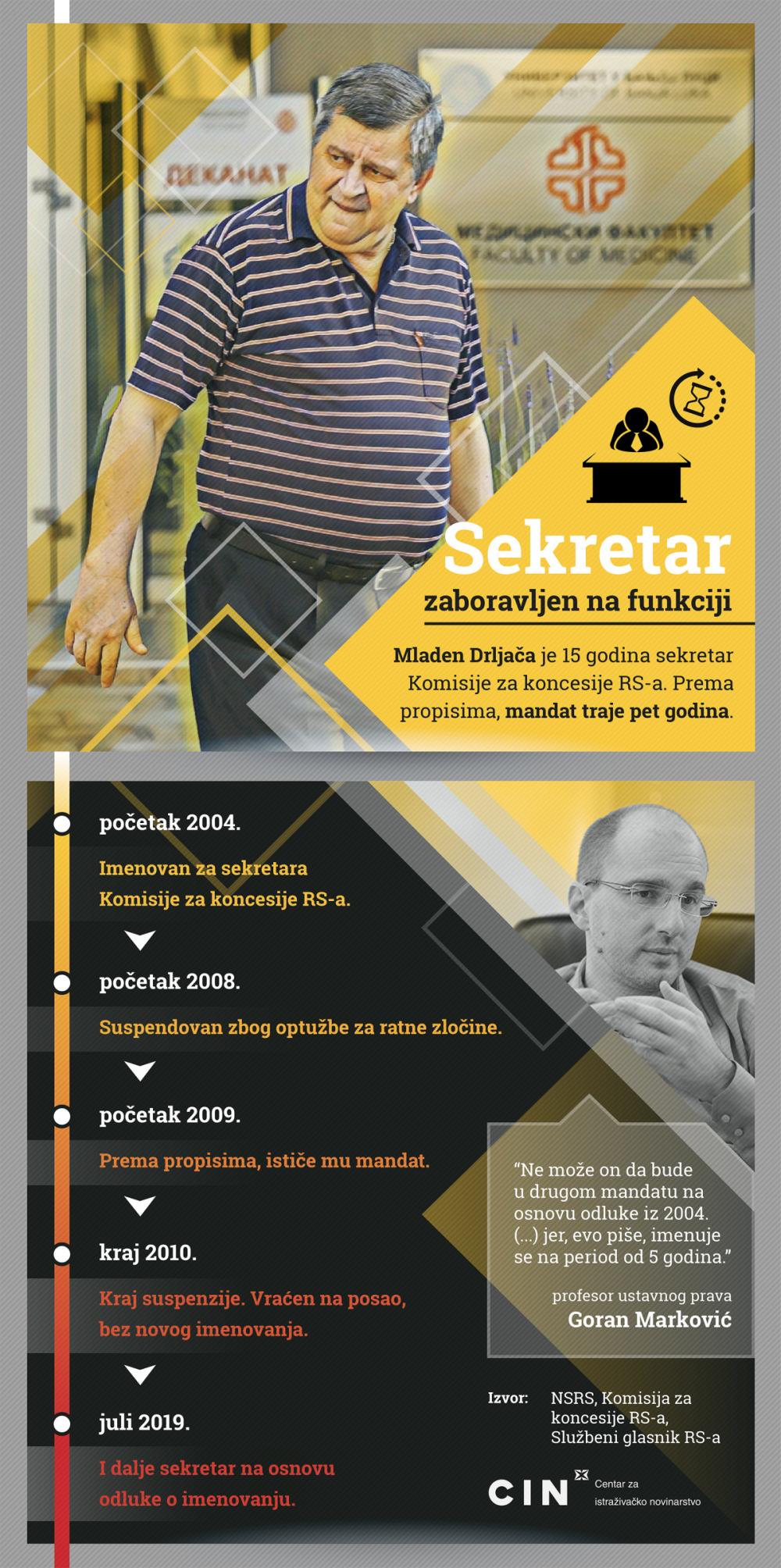 Drljača je još prije 15 godina imenovan na ovu poziciju. Prema propisima, mandat sekretara traje pet godina. Od tada nije bio ponovo biran niti je dobio drugi osnov za rad.