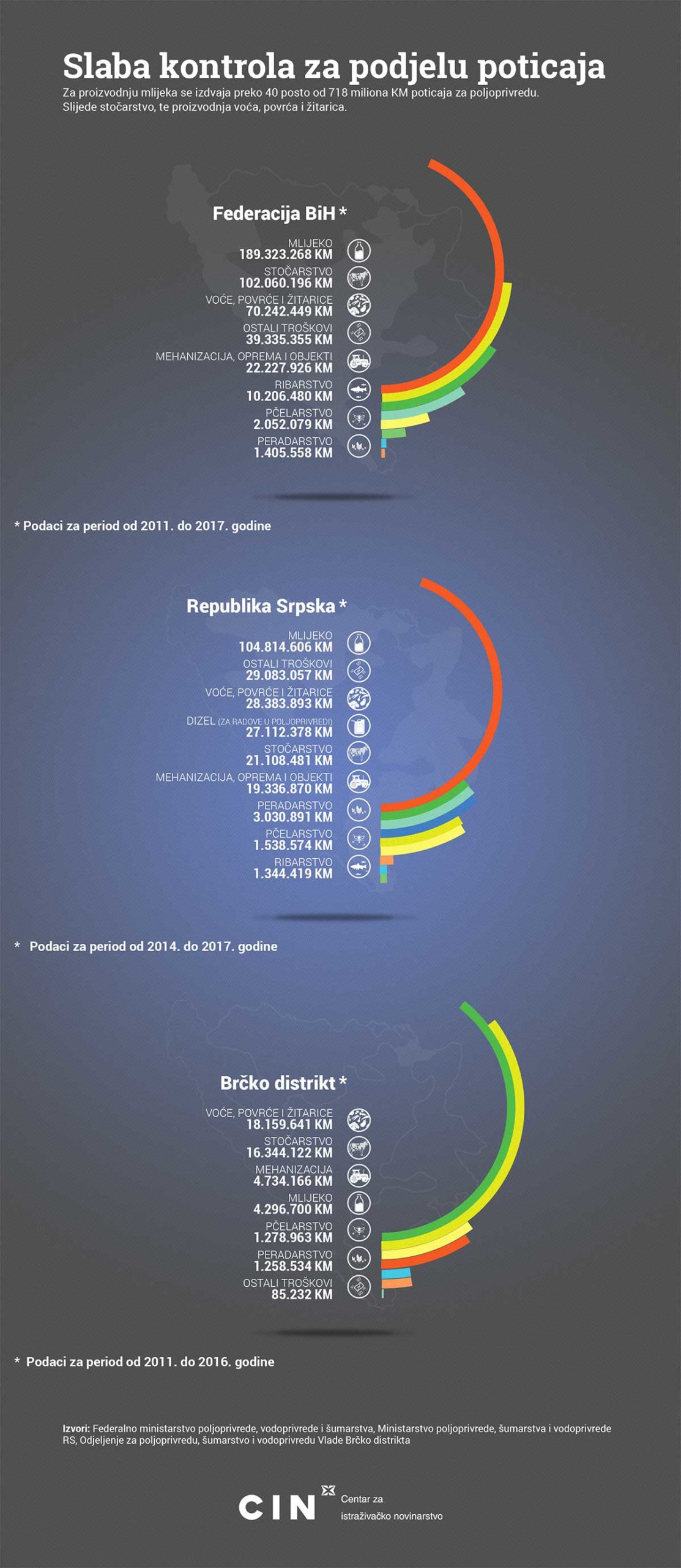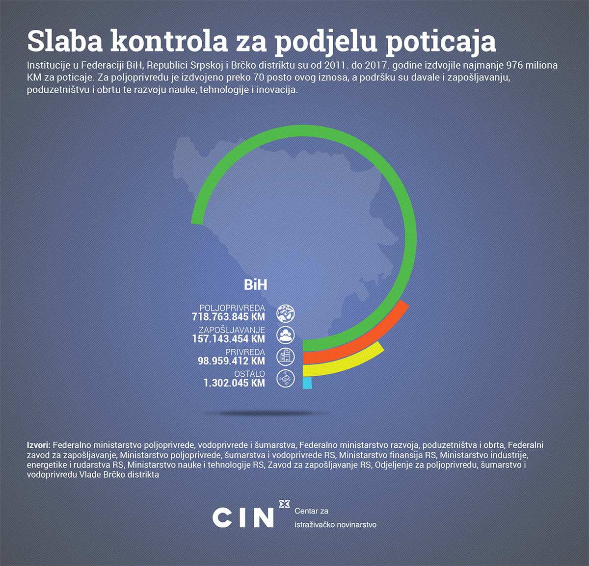 Devet institucija u Bosni i Hercegovini (BiH) je od 2011. do 2017. godine izdvojilo najmanje 976 miliona KM za poticaje poljoprivrede, zapošljavanja i privrede. Novinari Centra za istraživačko novinarstvo (CIN) su prikupili podatke o trošenju ovog novca te kreirali bazu koja objedinjuje informacije o odobrenim i isplaćenim poticajima u Federaciji BiH, Republici Srpskoj (RS) i Brčko distriktu.