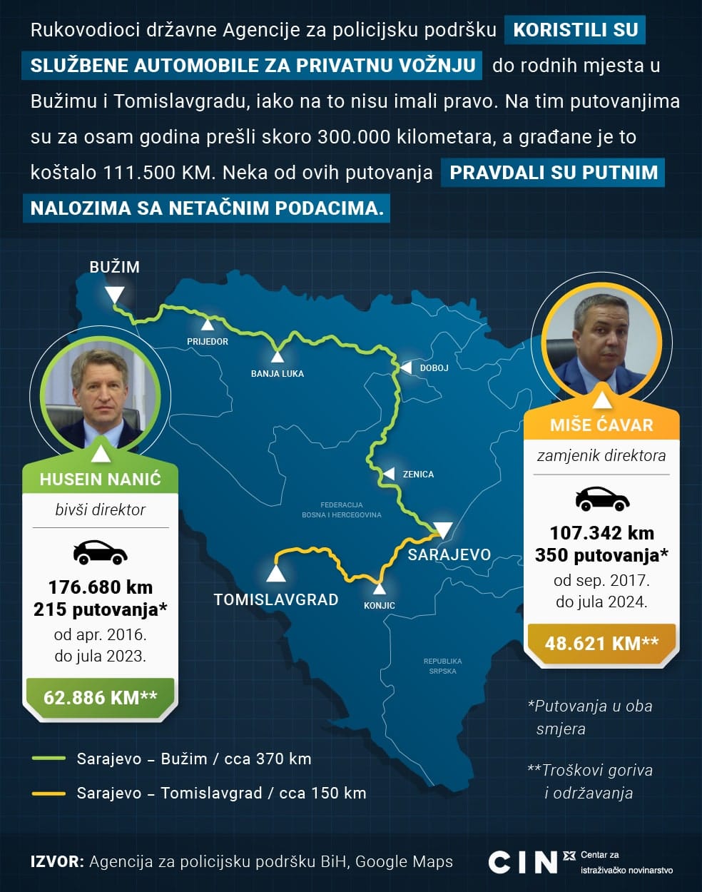 Analizom dokumentacije Agencije za policijsku podršku BiH, Autocesta Federacije BiH (FBiH), Autoputeva Republike Srpske (RS) i Hrvatskih autocesta, novinari CIN-a su otkrili da su njih dvojica koristili službene automobile za vrijeme vikenda, ali i godišnjih odmora.