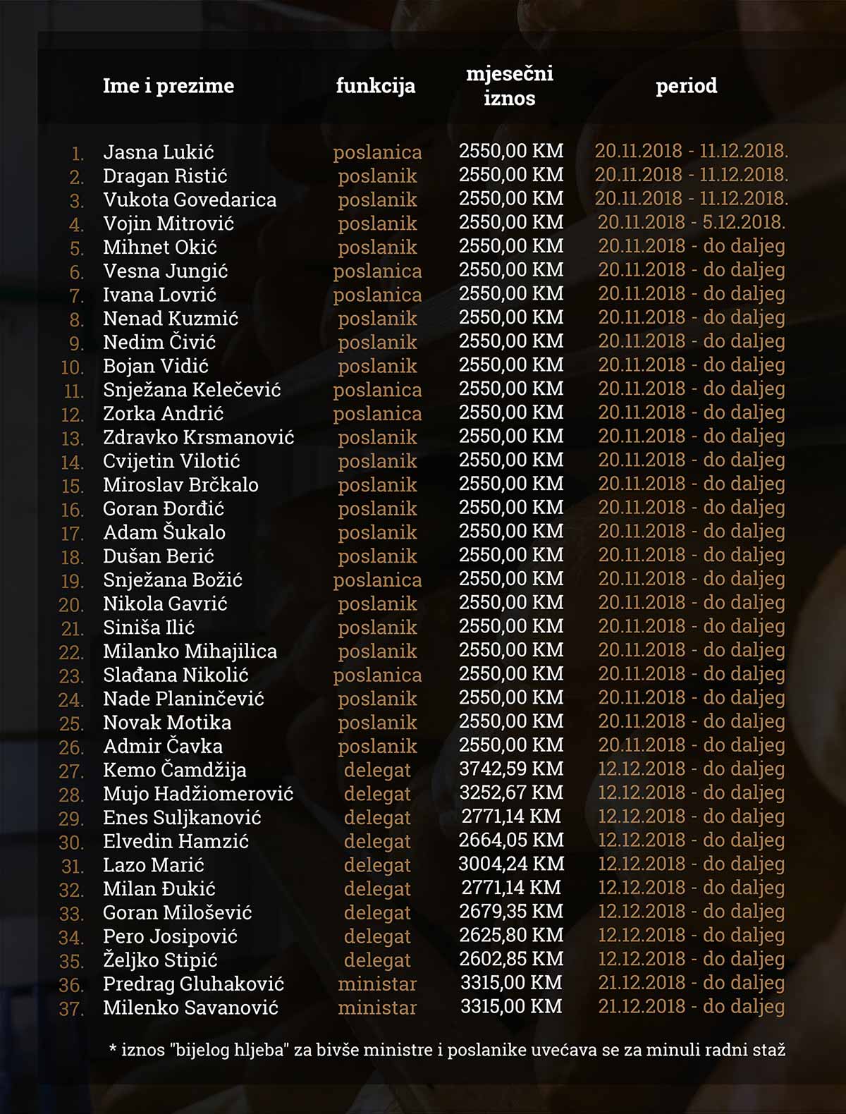 Krajem 2018. godine „bijeli hljeb“ je dobilo 26 poslanika Narodne skupštine, devet delegata Vijeća naroda i dva ministra Vlade RS-a kojima su istekli mandati. Oni imaju pravo šest mjeseci primati plaću iako ne rade ništa. Naknada će biti ukinuta ako se u tom periodu zaposle na neodređeno na drugom mjestu.