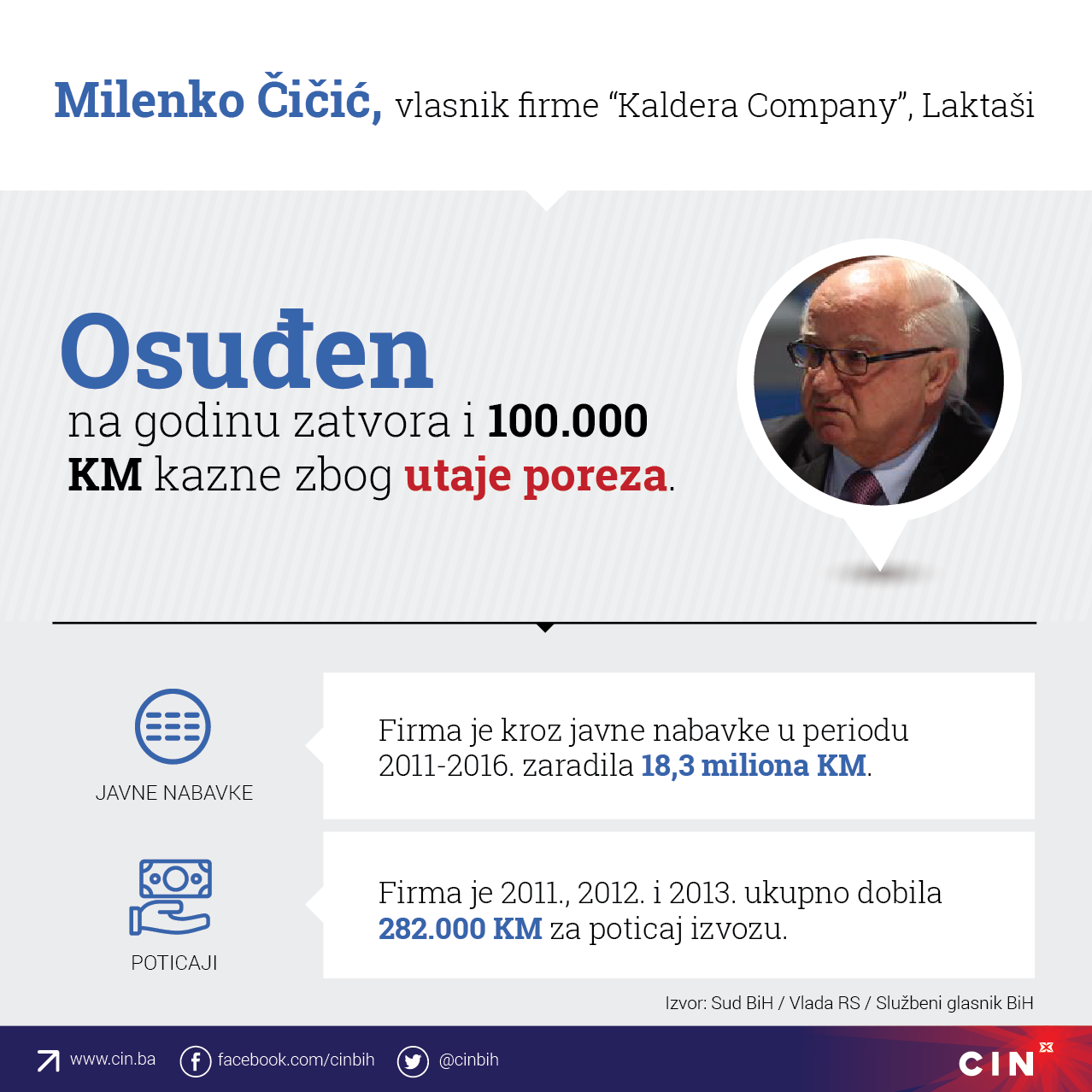 Milenko Čičić, vlasnik i direktor firme „Kaldera Company“ iz Laktaša, je pred Sudom Bosne i Hercegovine (BiH) proglašen krivim za utaju poreza. Osuđen je na godinu dana zatvora i novčanu kaznu od 100.000 KM.