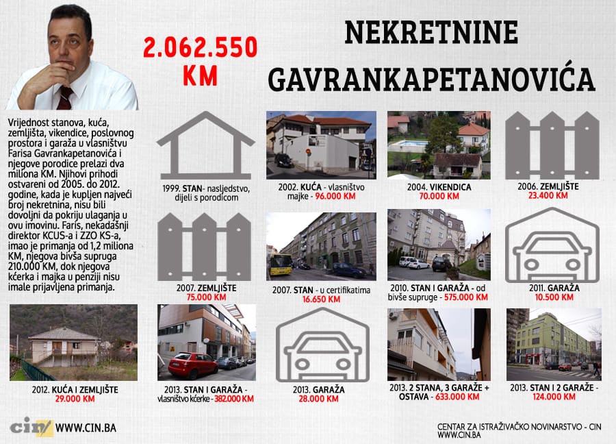 Kada je prije petnaest godina imenovan na mjesto zamjenika federalnog ministra zdravstva, doktor Faris Gavrankapetanović nije imao imovinu koju posjeduje danas. Nakon dugogodišnjeg obavljanja javnih funkcija u zdravstvu postao je vlasnik: nekoliko stanova, kuća, poslovnog prostora, vikendice i zemljišta.