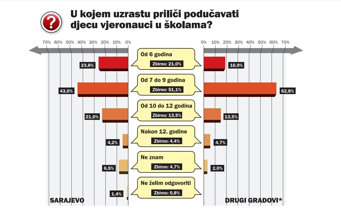 Ono što, prema riječima stručnjaka, ipak nije lako objasniti jeste to da najveći broj roditelja koji su podržali odluku sarajevskih vrtića i izjasnili se u prilog časova vjeronauke u školskom uzrastu, živi van granica samog Kantona. Naime, uvođenje vjeronauke u vrtiće podržava 36,4 posto roditelja iz Sarajeva i 45,3 posto roditelja iz osam većih bh. gradova.