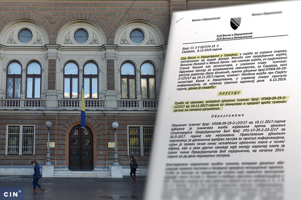 Sud Bosne i Hercegovine smatra da je nezakonito rješenje Žalbenog vijeća pri Vijeću ministara kojim su novinarima Centra za istraživačko novinarstvo (CIN) odbili dati informacije o pojedinačnim platama i naknadama članova Predsjedništva Bosne i Hercegovine (BiH). Rješenje je poništeno i vraćeno Vijeću na ponovno odlučivanje.