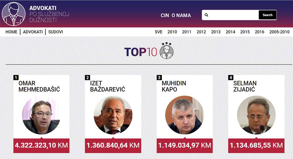 The Center for Investigative Reporting in Sarajevo (CIN) has created a unique online database about reimbursements to court-appointed lawyers between 2010 and the end of 2016. The combined reimbursement for 1,247 lawyers and law offices during this period runs to at least 76.2 million KM. Some of this money is still due to lawyers.
