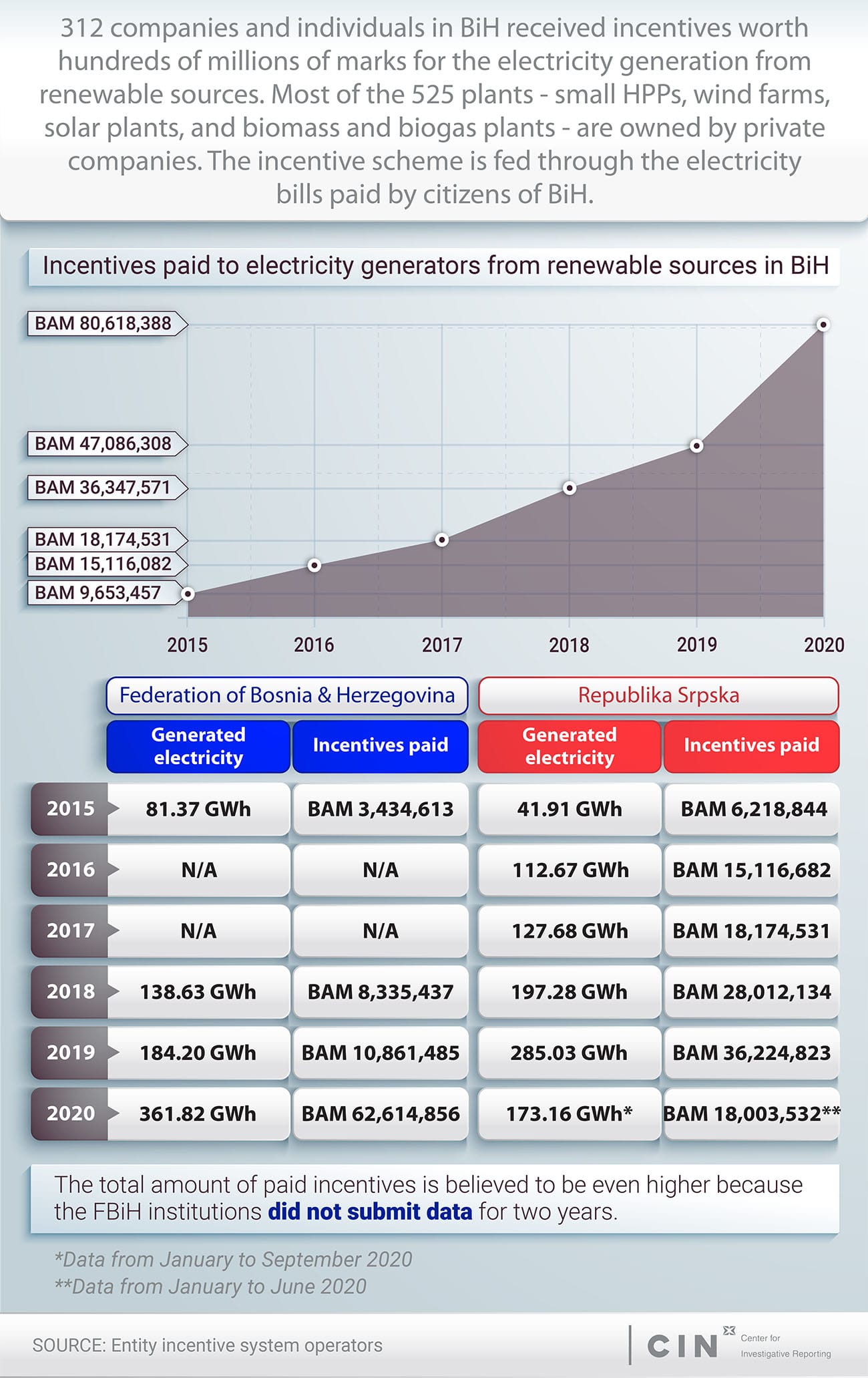 Every month, citizens of Bosnia and Herzegovina through their electricity bill pay a fee for electricity generation from renewable sources. Over six years, they paid at least BAM 207 million, which the Entity authorities distributed mainly to private companies as an incentive for the production of the so-called “clean electricity”. These companies are owners of 525 small hydropower plants (SHPPs), wind farms, solar, biomass and biogas plants that produce about two percent of the country’s total electricity production, and generate large revenues from the incentives.
