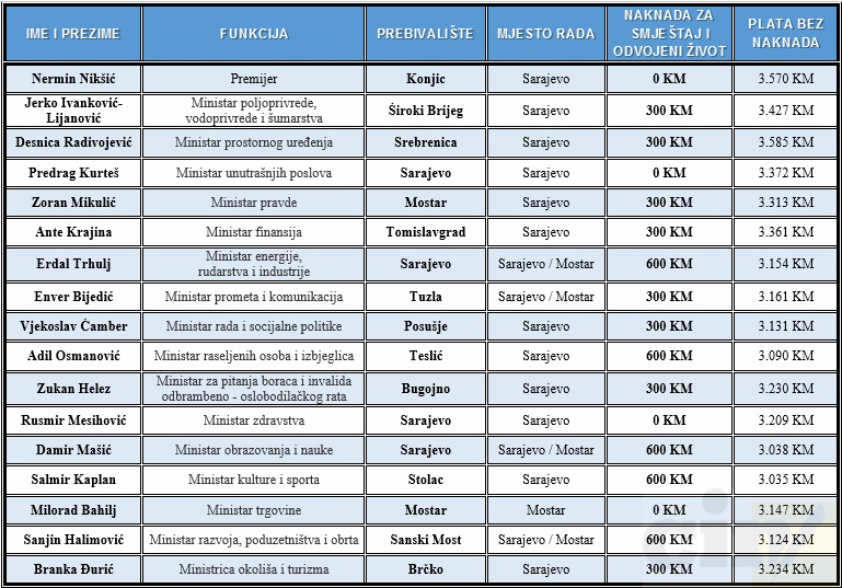 Od 17 članova Vlade tek četvero ne prima naknadu za smještaj i odvojeni život: ministar unutrašnjih poslova Predrag Kurteš, ministar trgovine Milorad Bahilj i ministar zdravstva Rusmir Mesihović nemaju pravo na ove naknade jer im je prebivalište u gradu u kojem rade, dok premijer Nermin Nikšić živi u Konjicu, 50-ak km udaljenom od Sarajeva.