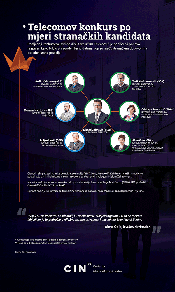 Posljednji konkurs za izvršne direktore u „BH Telecomu“, jednoj od najprofitabilnijih državnih firmi, poništen je i ponovo raspisan kako bi bio prilagođen kandidatima koji su međustranačkim dogovorima određeni za te pozicije.